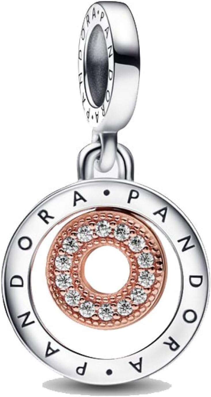 Il nostro ciondolo iconico reinventato come un fascino. Il Pandora Signature Two-tone Logo Circles ciondola Charm presenta un cerchio placcato oro rosa 14k con pavé scintillante che gira all’interno di un cerchio in argento sterling lucido decorato con il logo Pandora. Questo pezzo dinamico combina i motivi molto amati della collezione rendendolo l’aggiunta perfetta al tuo braccialetto.