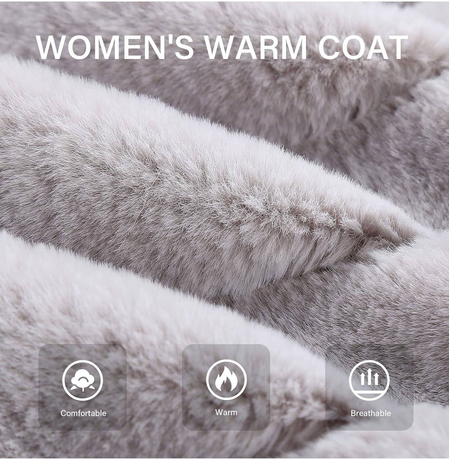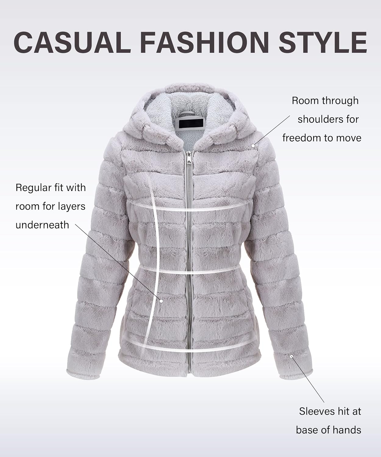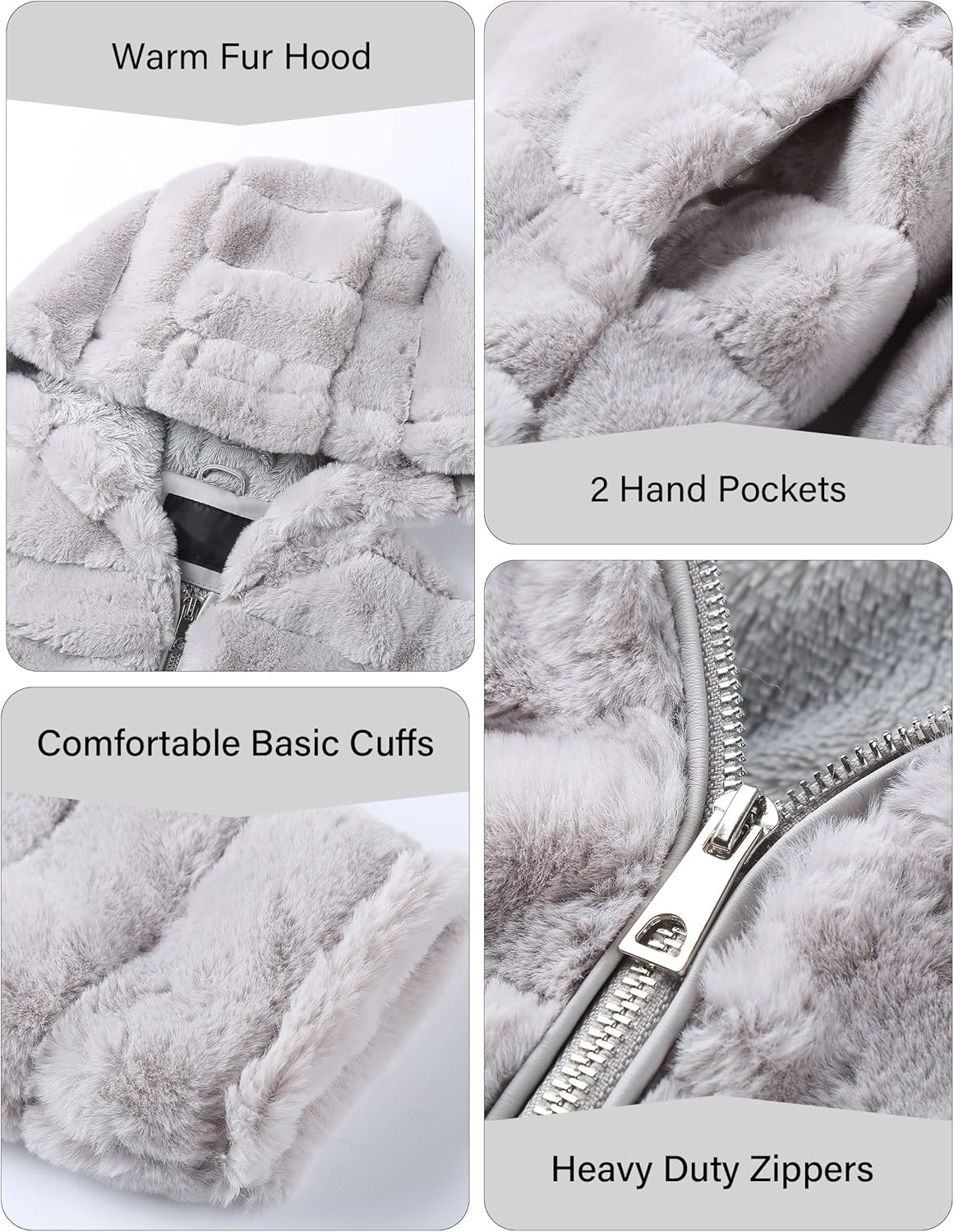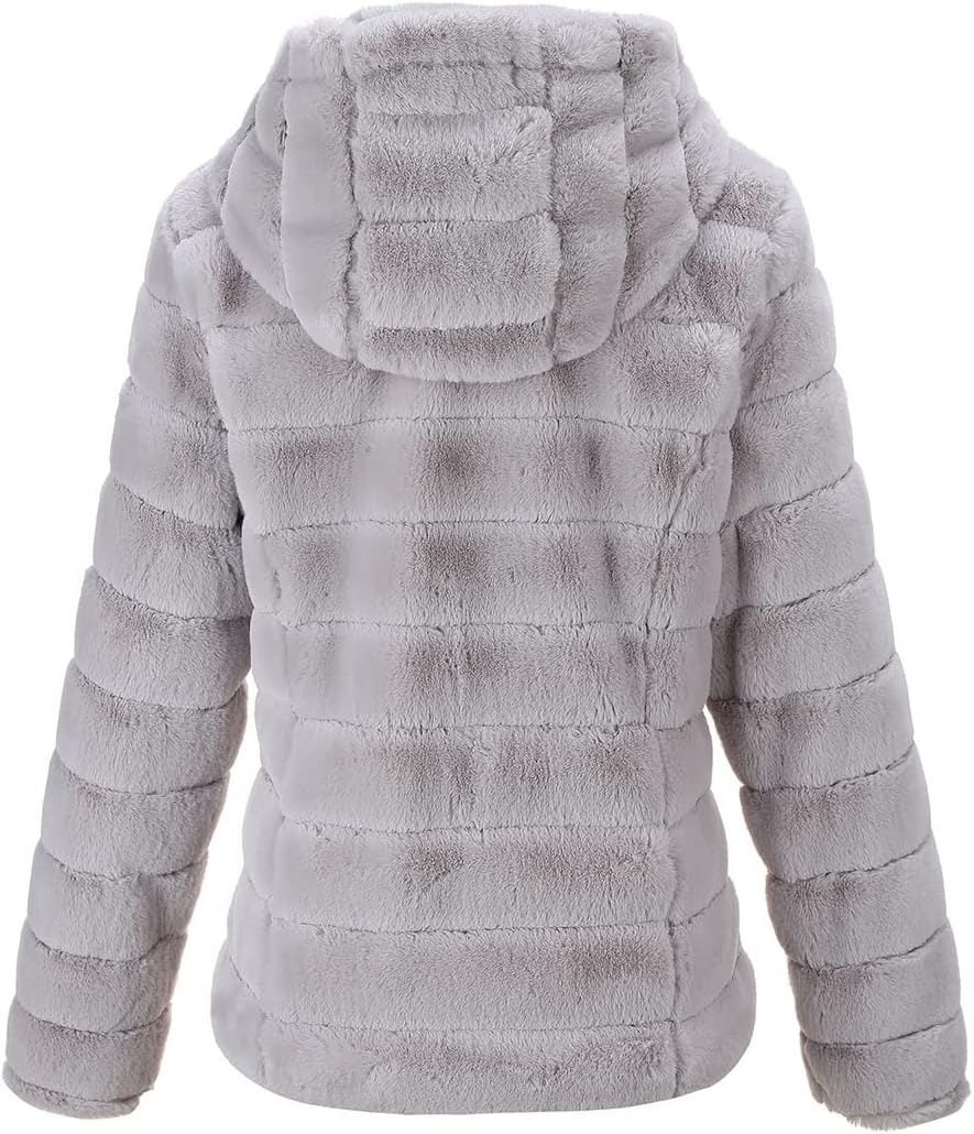 Giacca da donna in pelliccia sintetica con due tasche laterali e cappuccio, ideale per l’autunno e l’inverno.