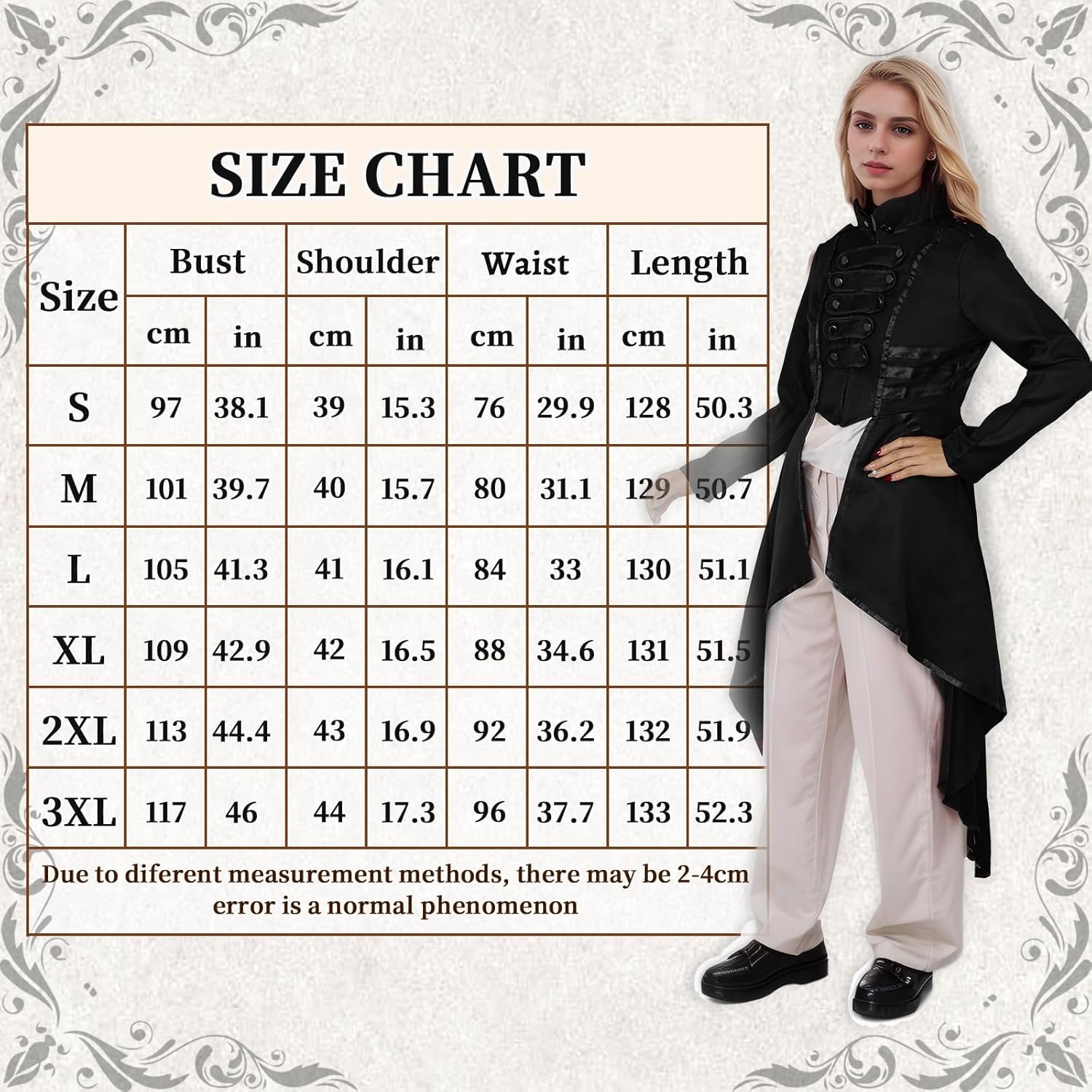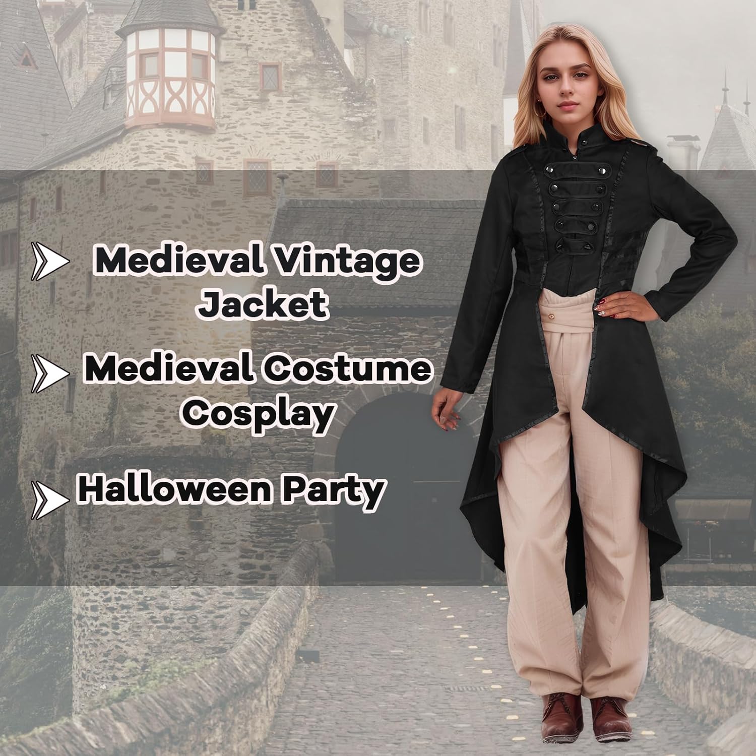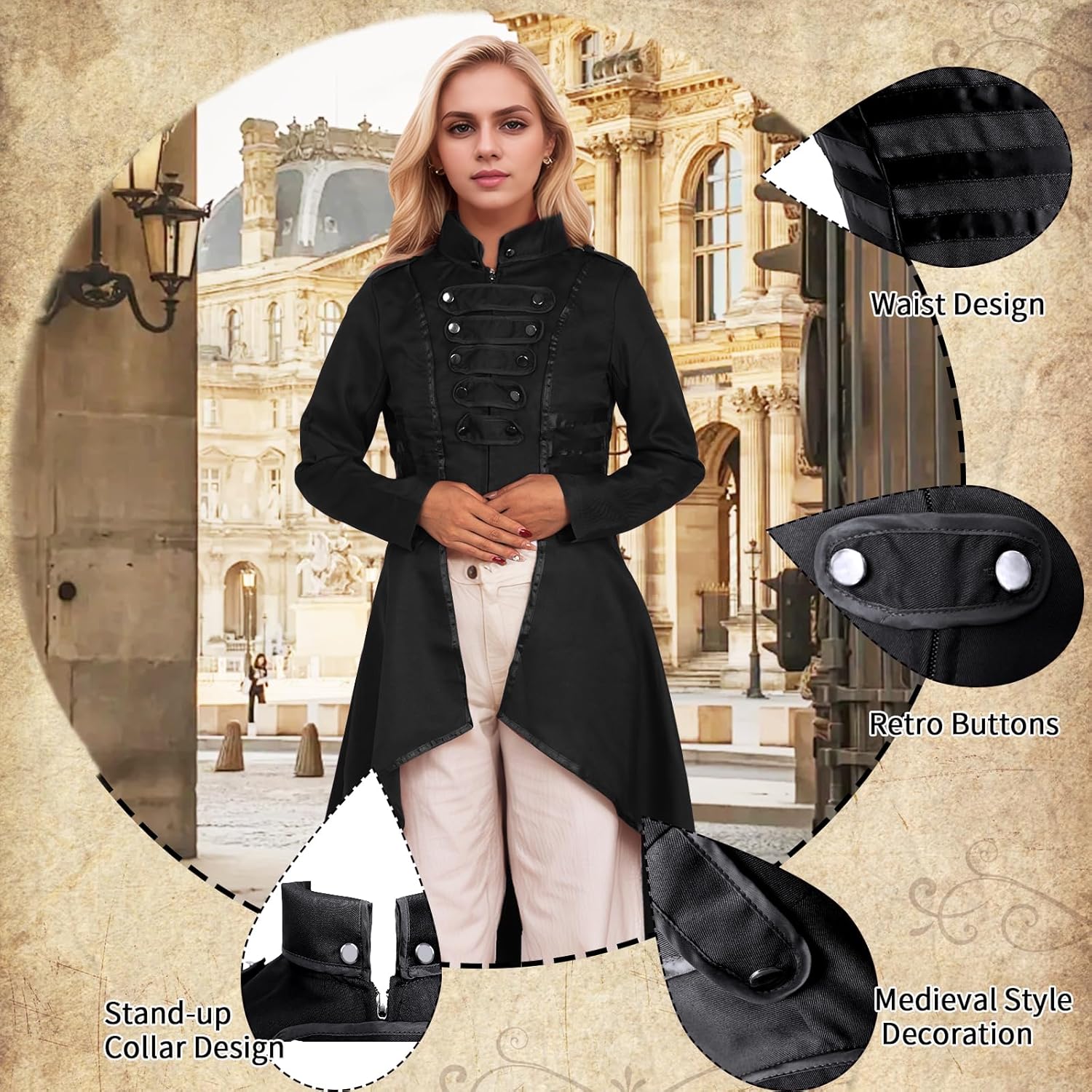 Look vintage stile medievale retrò + steampunk, il cappotto da donna si abbina perfettamente a pantaloni, stivali o scarpe per completare il look vintage.